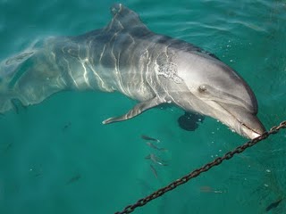 Dondurmamızı yedikten sonra Milas Karayolu üzerindeki Güvercinlik Koyu’na doğru yola çıkarak Aqua Dolphin‘e gidiyoruz. İki küçük havuzda iki yunus. Bedeli mukabili, dokunmak, birlikte yüzmek ve beslemek mümkün. Çoğu kişi birlikte yüzmeyi tercih etsede ilk kez bir yunusu bu kadar yakından gören Çağan ve Çaka, yüzmeye cesaret edemeyip, sedece beslemeyi tercih ediyorlar. Çaka, korkudan ağzını bile tam tutturamıyor. Suya düşen balıkları, yunusun neden denizden yakalayıp yemediğini sorduğumuzda, yunusların avcı olmadıklarını, bir kaç yunus balık sürüsünü kovalarken grubun geri kalanının karşı yönde ağızları açık balıkları beklediklerini, ancak bu şekilde beslenebildiklerini ve bu yüzden tek başlarına yaşayamadıklarını anlatıyorlar.