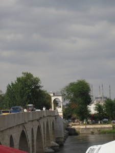 Belediyenin, Çay Bahçesi olarak işlettiği gümrük binasında bir müddet oturup, Meriç’i ve Selimiye’nin siluetini seyrediyoruz. Sadece yaya ve faytonlara açık olması gereken sanat eseri köprüler üzerinde biraz yürümek istiyoruz ama o kadar çok araç geçiyor ki tehlikeli oluyor. Karaağaç tarafından bakınca Edirne, nehir kenarında gelişen klasik bir Avrupa şehri. Ayrıntı Osmanlı’nın zarafetinde.