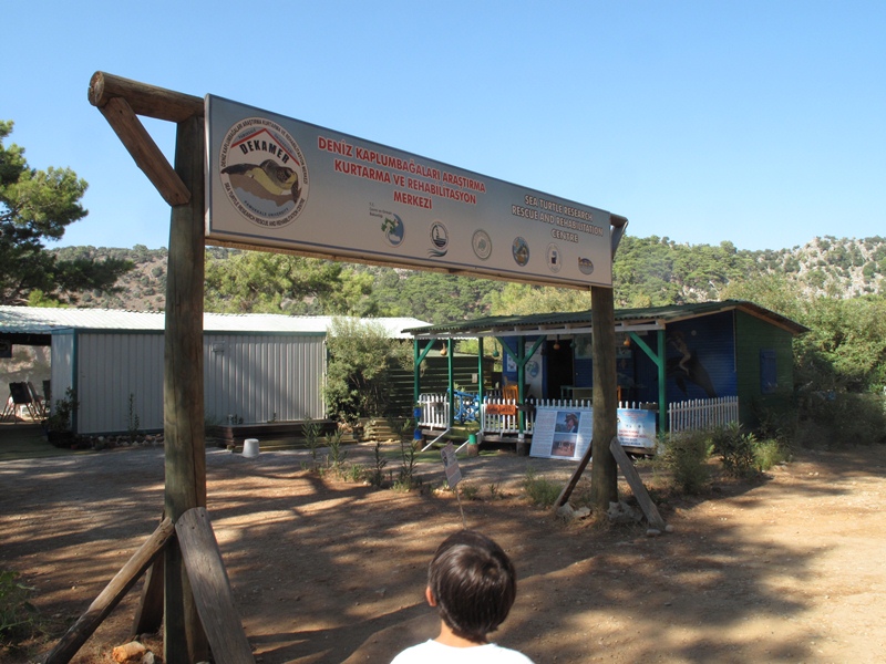 Plajın arkasında, ağaçların arasında, derme çatma konteynırların birleştirilmesi ile oluşturulmuş Caretta kaplumbağaları Rehabilitasyon Merkezi’ne uğruyoruz öncelikle. Deniz Kaplumbağaları Araştırma ve Rehabilitasyon Merkezi, Pamukkale Üniversitesi’nin bir girişimi.