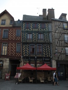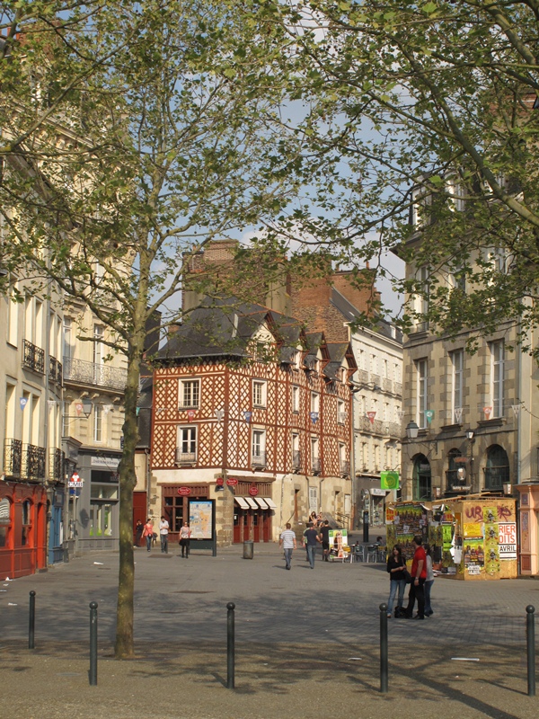 Place St.Anne, tarihi Rennes’in merkezi. Kısmen bu meydanda ve meydana açılan sokaklarda tek tük ağaç işlemeli, yarı ahşap, Bretanya, Normandiya ve Alsaz ( Alsace – Starsbourg’da görmüştük )bölgelerine mahsus özel evlerden mevcut. Rennes, büyük şehir olduğu için fazla korunmamış ama bölgedeki diğer