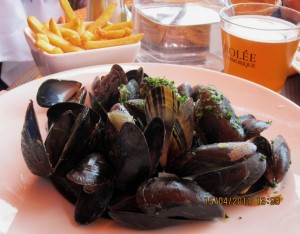 midyeyi tamamen açıp, içindekini elle alıp yiyorsunuz. Kibarlık etmek istiyorsanız patatesleri elle almayıp, önümüzdeki masada aynısını yiyen Fransız hanımın yaptığı gibi, midye kabukları ile tutabiliyorsunuz. Bütün Fransızlar bunu yiyor. Honfleur’e midye yemek için gelmişler.