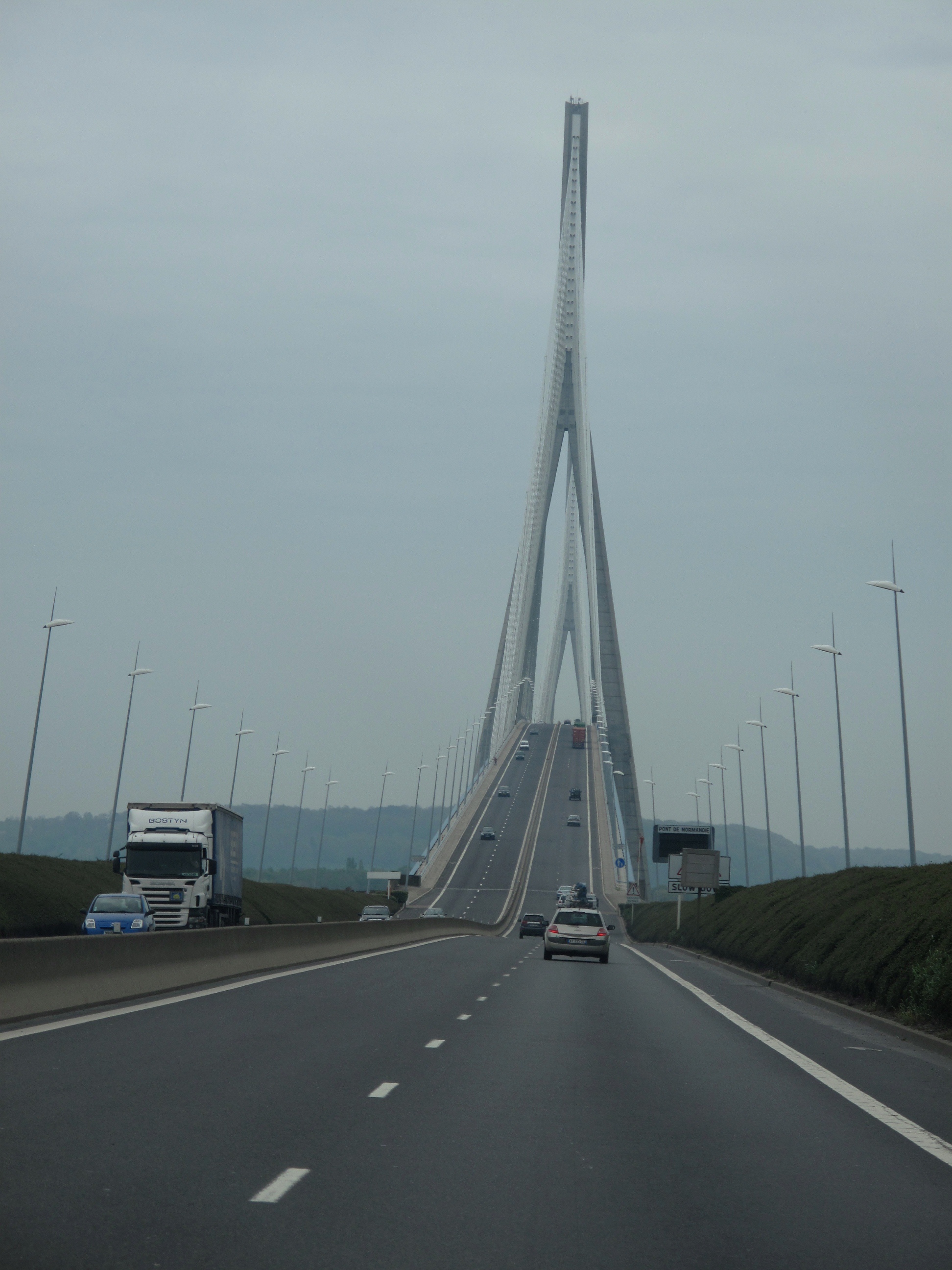 Le Havre’ın içine girmeyip batıya, Normandiya kıyılarına doğru yönlenerek, Honfleur’e gitmek için ünlü Normandiya Köprüsü’nden geçerek Seine’i bir kere daha enine geçmiş oluyoruz. Son derece iddialı bir mimariye sahip, göz alıcı modern bir köprü P ont de Normandie.