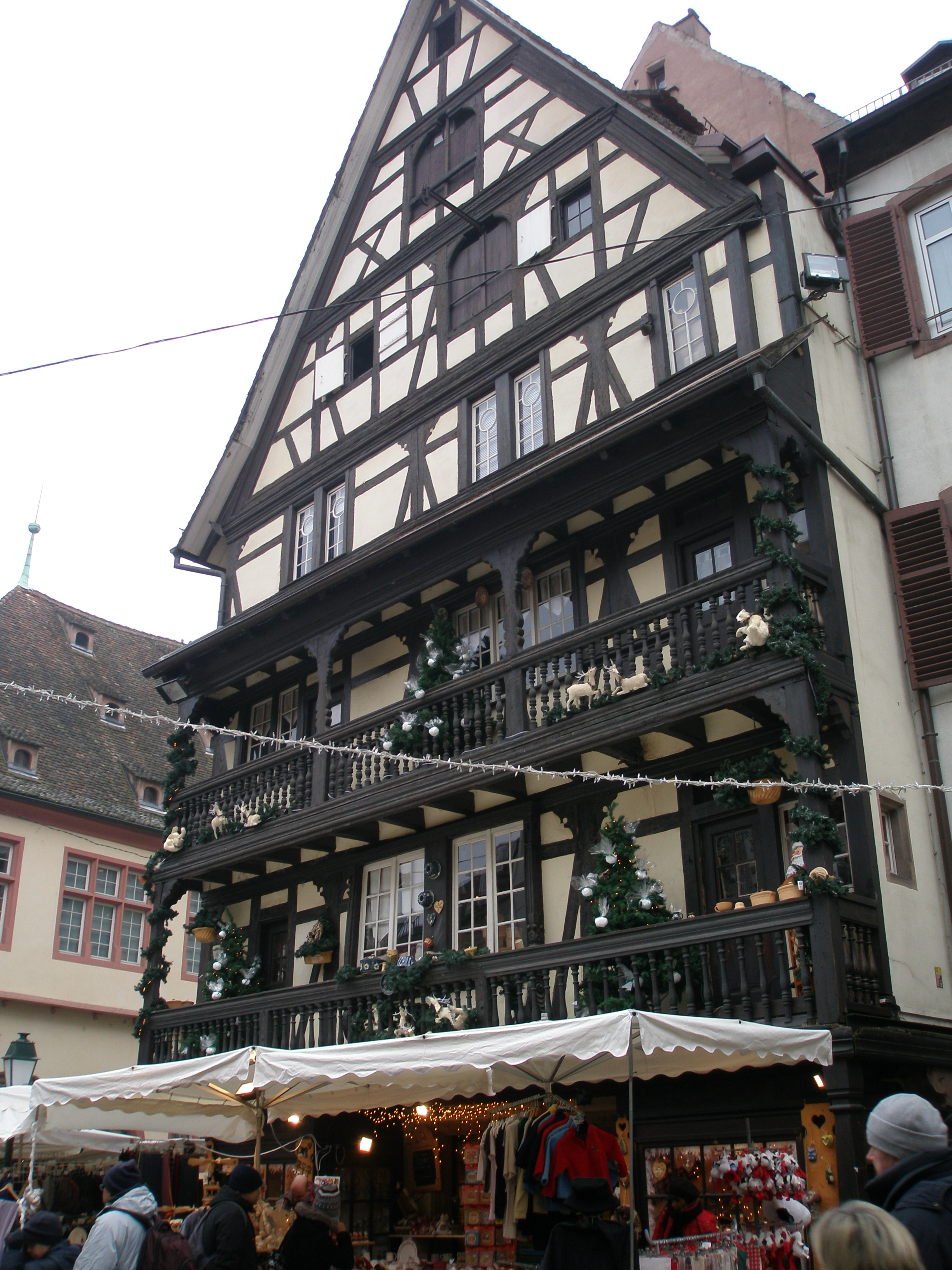 Ahşabın hakimiyetindeki yapılarda, başka bir özellik daha göze batıyor. Çatılarında, bizim mimari tiplerimize göre oldukça aykırı olarak, 2 hatta 3 çatı katı bulunuyor. Dik çatı eğimi, kış aylarının çok sert geçtiği kuzey ülkelerinde, kar birikmesini önlemeye yönelik kullanılan bir yapılanma şekli. Strasbourg daki özellik ise, çatı pencerelerinin yanında ayrıca kuş yuvalarınında özellikle inşaa ediliyor oluşu. Göçmen kuşların göç yolu üzerinde bulunan ve konaklama noktalarından biri olan Strasbourg, göçmen kuşlardan leyleği, bir çeşit simge gibi turistik amaçlı kullanıyor.